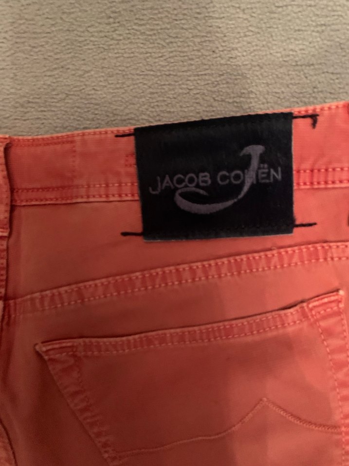 Jacob Con markalı, kırmızı malzemeden üretilmiş, fermuarlı ve baskılı, normal boyda, erkek pantolonu.