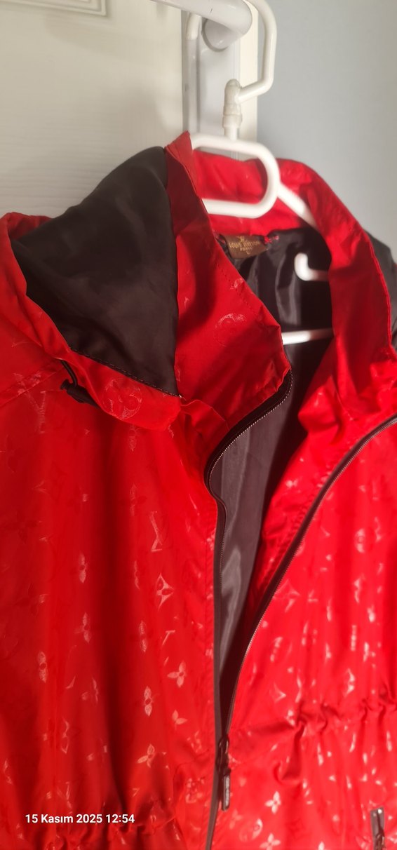 Parlak kırmızı sentetik kumaştan, fermuarlı erkek yağmurluk. kapsunlu, bol kesim ve uzun kollu, dış mekan için ideal.