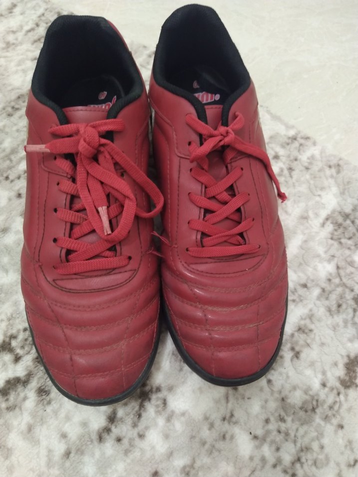 Kırmızı erkek futbol ayakkabısı, kauçuk tabanlı, velcro ve bağcık detaylı. Spor ve günlük sokak stili için uygundur. ⚽