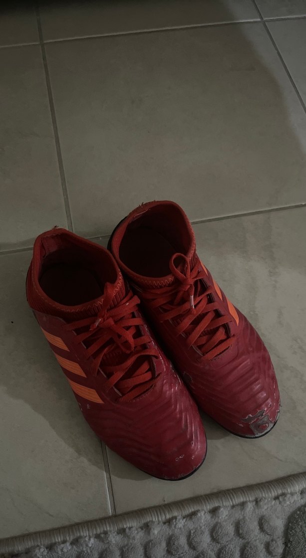 Kırmızı renkli, dayanıklı kauçuk malzemeden yapılmış, velcro bağlamalı erkek futbol ayakkabısı. Spor ve sokak stiline uygun, desensiz ve renkli.