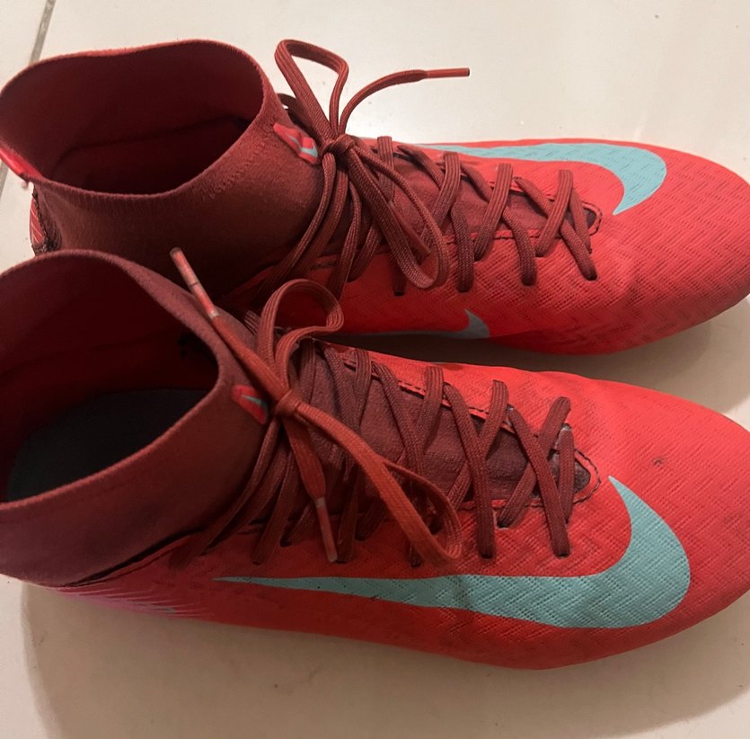 Canlı kırmızı ve mavi detaylı erkek futbol ayakkabısı, kauçuk malzeme ve velcro bağcıklı. Spor için uygundur. ⚽