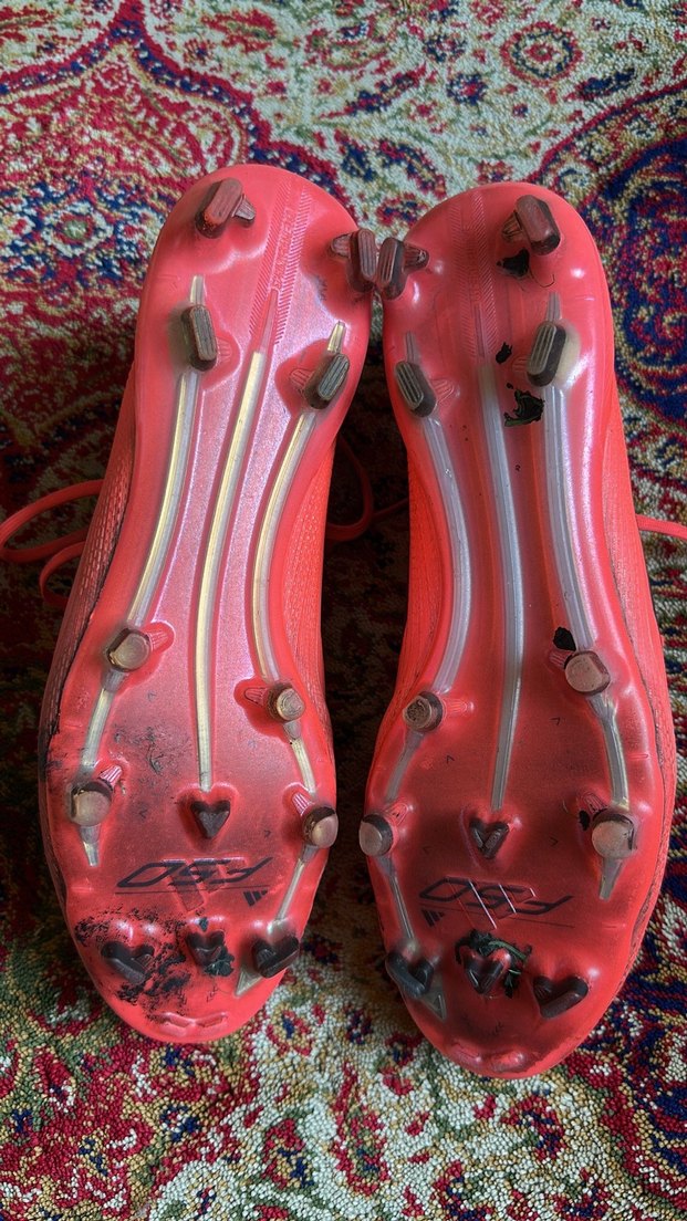 Kırmızı, tokalı kauçuk tabanlı erkek futbol kramponları. Renkli, desensiz tasarımıyla spor ve modaya uygun. ⚽