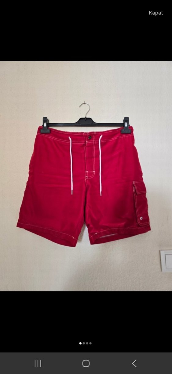 Kırmızı renkli, bol kesim ve kemerli erkek mayo şortu. Düz ve sokak stili tasarımıyla plajda kullanıma uygun.