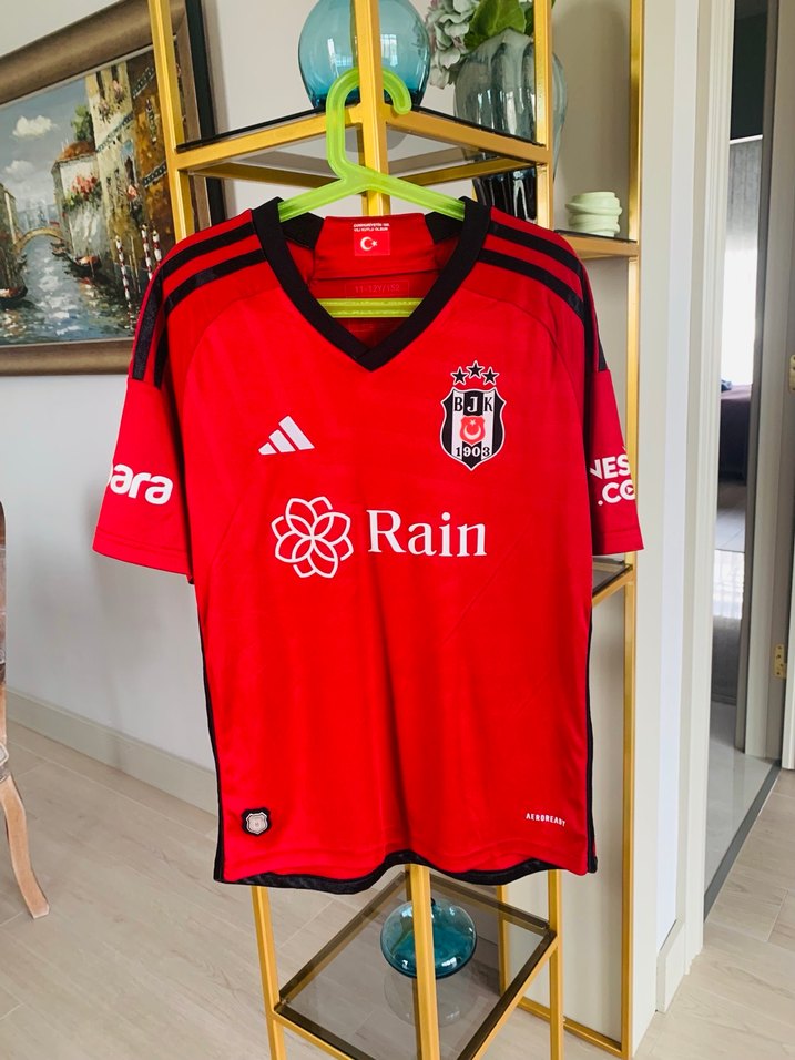 Kırmızı renkli, kısa kollu ve fitted kesime sahip erkek forması. Sentetik kumaştan, baskılı detaylı ve velcro özellikli. Spor ve sokak stiline uygun. ⚽gayet iyi durumda ve kullanışlı.23-34 sezonu.11-12 yaşa uygun