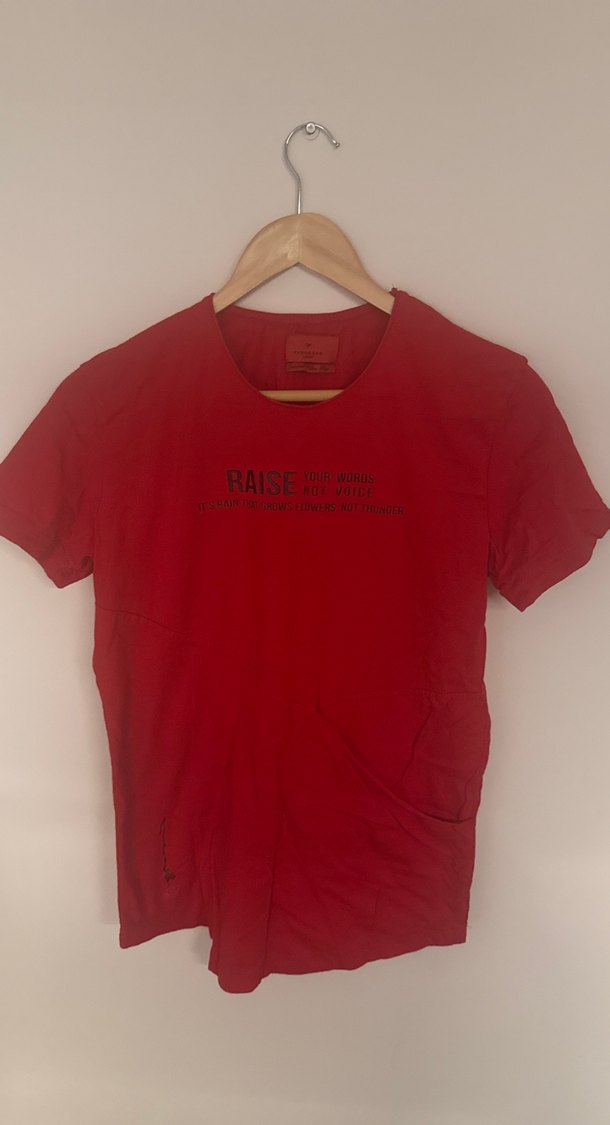 Kırmızı süet kısa kollu erkek tişörtü, rahat kesim ve bisiklet yaka ile. Önünde 'RAISEWW' baskılı, sokak ve athleisure tarzını birleştirir.