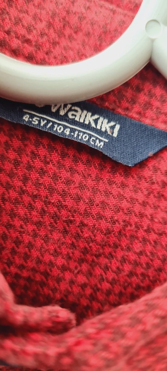 Kırmızı örgü sentetik kumaştan, uzun kollu, yakası çentikli, koyu tonlarda tie-dye desenli erkek sweatshirt. Sokak stilinde, rahat ve vücuda oturan kesim. Lcw marka 4-5 yas kirmizi kareli gomlek, hic bir sorunu yok...