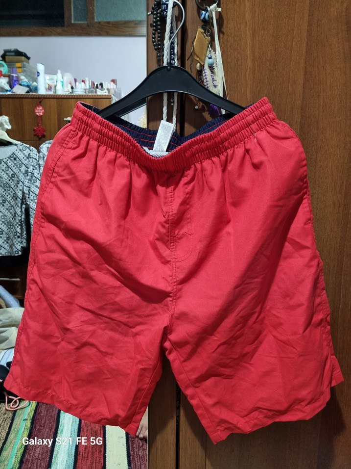 Kırmızı, bol kesim midi boy erkek yüzme şortu, günlük rahat kullanım için elastik bel ve bağcıklı tasarıma sahip.