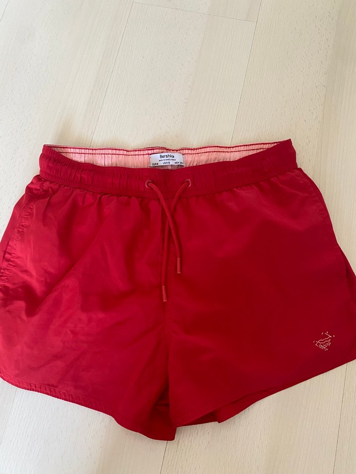 Parlak kırmızı renkte, bol kesim ve bağcıklı elastik bel detaylı erkek mini şort mayo. Düz tasarımıyla plaj ve sokak stiline uygundur.