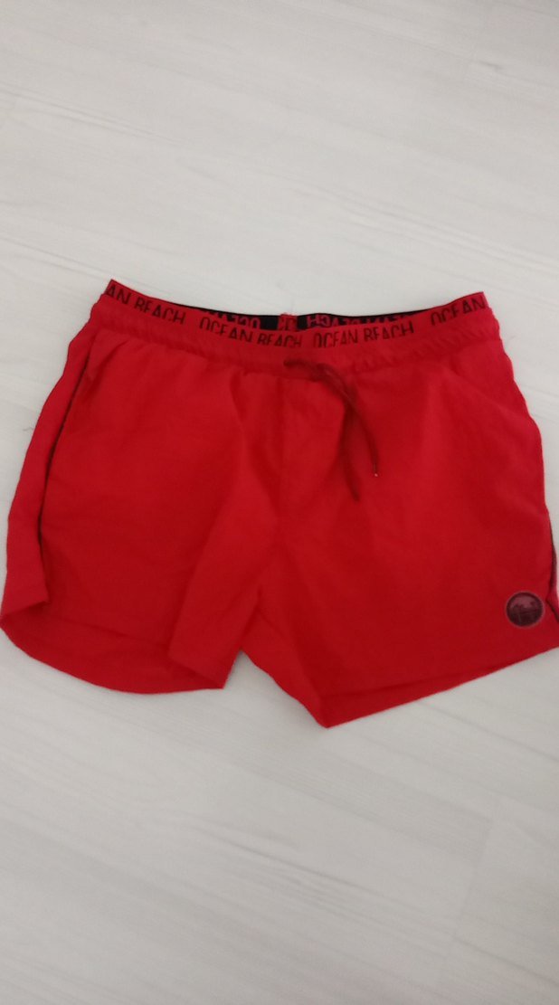 Kısa kesim, düz tasarımlı kırmızı erkek şort mayo, plajda rahat ve şık bir görünüm sunar.