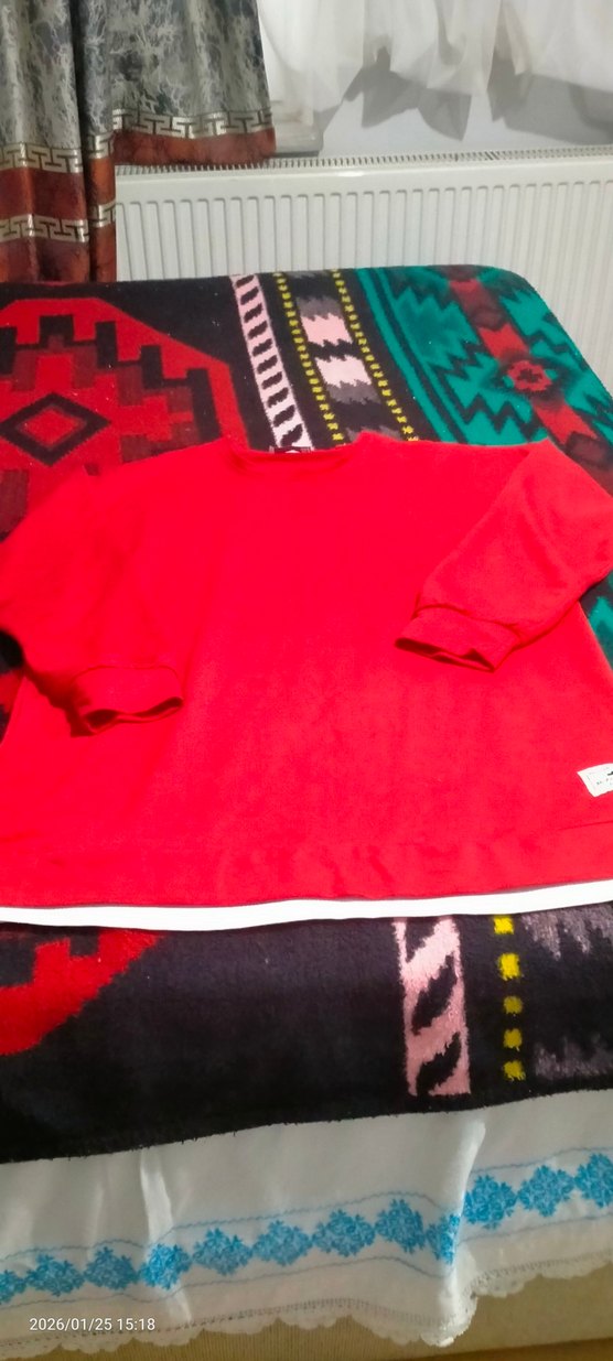 Kırmızı renkte, uzun kollu, yuvarlak yakalı ve bol kesim erkek polar sweatshirt. Günlük kullanım için rahat ve renkli, sade tasarıma sahiptir.