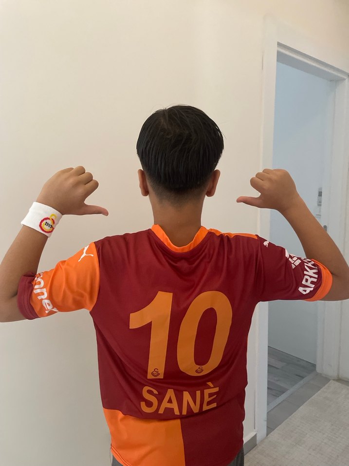 Kırmızı parlak sentetik kumaştan, kısa kollu, bisiklet yaka ve normal boyda, velcro detaylı erkek spor forması. Üzerinde 10 numara ve SANÉ yazısı baskılıdır.