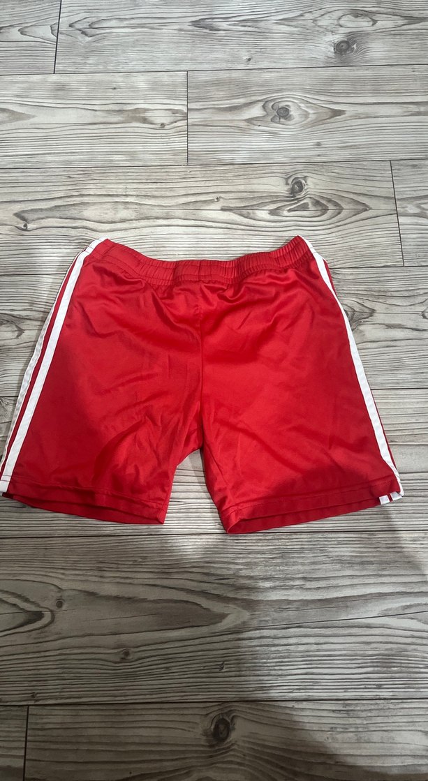 Parlak kırmızı renkte, elastik bel bantlı, yanları beyaz şeritli, spor ve günlük kullanıma uygun erkek şortu.