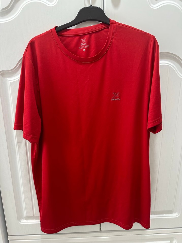 Kırmızı renk, kısa kollu erkek tişörtü, parlak sentetik kumaştan ve rahat kesimlidir. Spor ve günlük kullanım için uygun, sade baskılı logo ile şık görünümlü.
