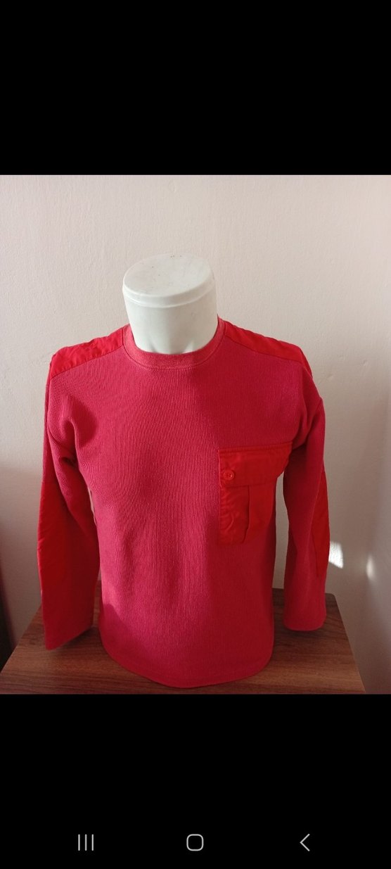 Kırmızı renk, yuvarlak yaka ve uzun kollu erkek triko sweatshirt. Normal boyda, rahat kesim ve göğüs cebine sahip. Günlük sokak stili için uygundur.