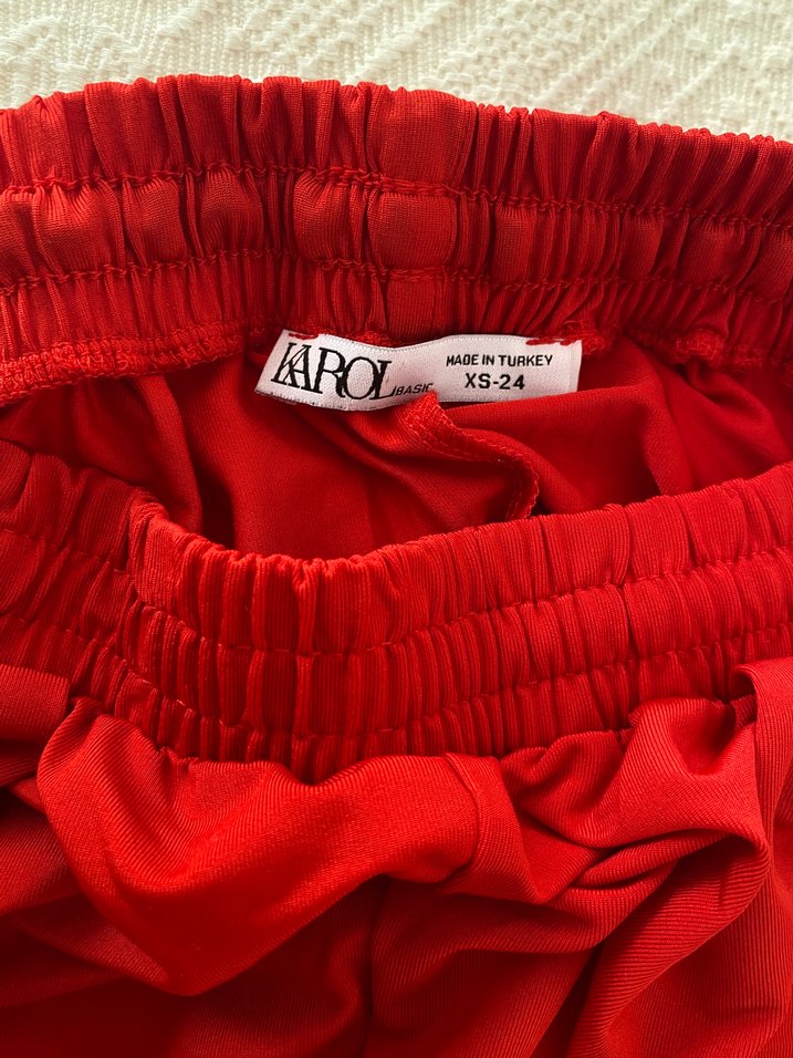 Sentetik kumaştan yapılmış, nakışlı desenli ve fırfırlı kırmızı mini pantolon. Rahat kesimi ve sokak stiliyle dikkat çeker. XS-24, Türkiye yapımı. ❤️