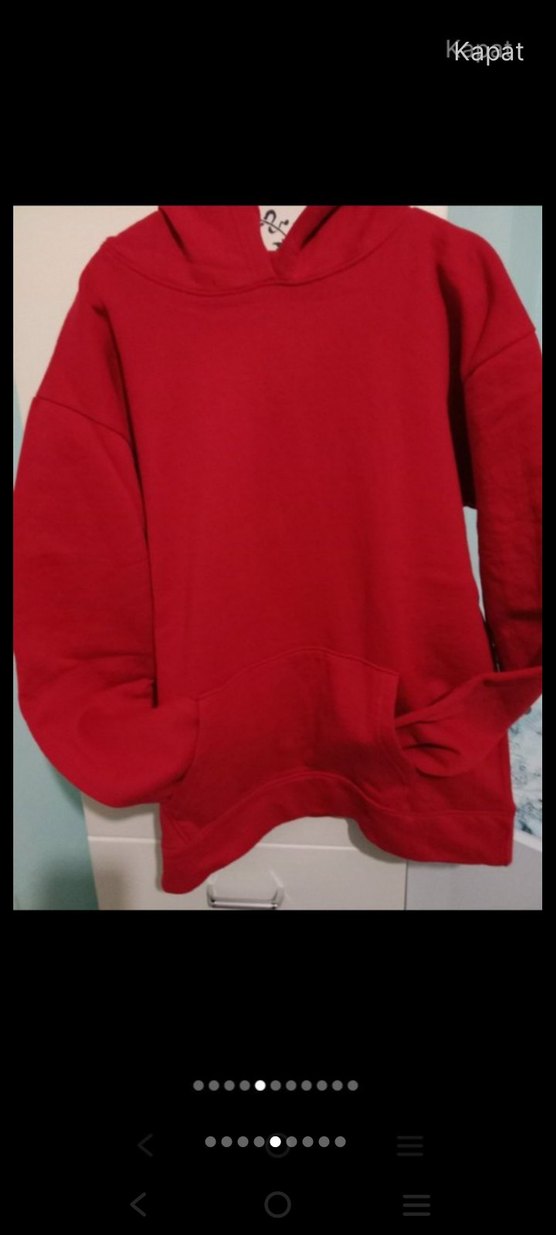 Sıfır urundur. Kırmızı (bordoya yakın bir kırmızı. Işığın etkisiyle böyle çıktı, bu denli parlak değil) uzun kollu, kapüşonlu sweat. Günlük kullanım için düz ve sade tasarıma sahiptir. Ölçüleri; en 60, boy 68 kol boyu 60 cm'dir. Herhangi bir sorunu bulunmamaktadır.