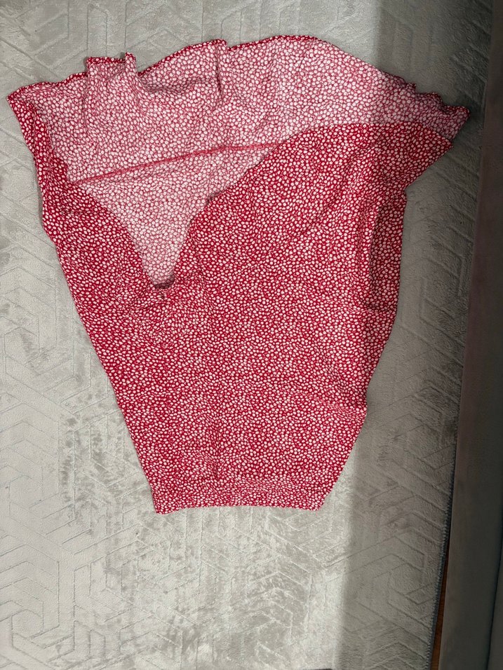 Sentetik kumaştan, kırmızı bağlama desenli, fırfırlı ve kısa kesim, vücuda oturan etek. ( defo parmakla gösterilen yer pek göze çarpmaz) tiril tiril - bazen s bazen m giyen birim ama kalıp sorunu yok oluyor