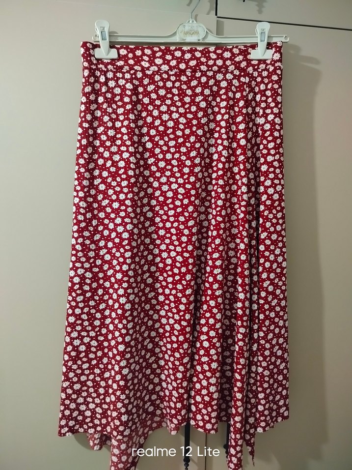 Kırmızı, küçük beyaz çiçek desenli, pamuk kumaştan piliseli ve bol kesim etek. Vintage bohem tarzını yansıtır. m bedene uygundur