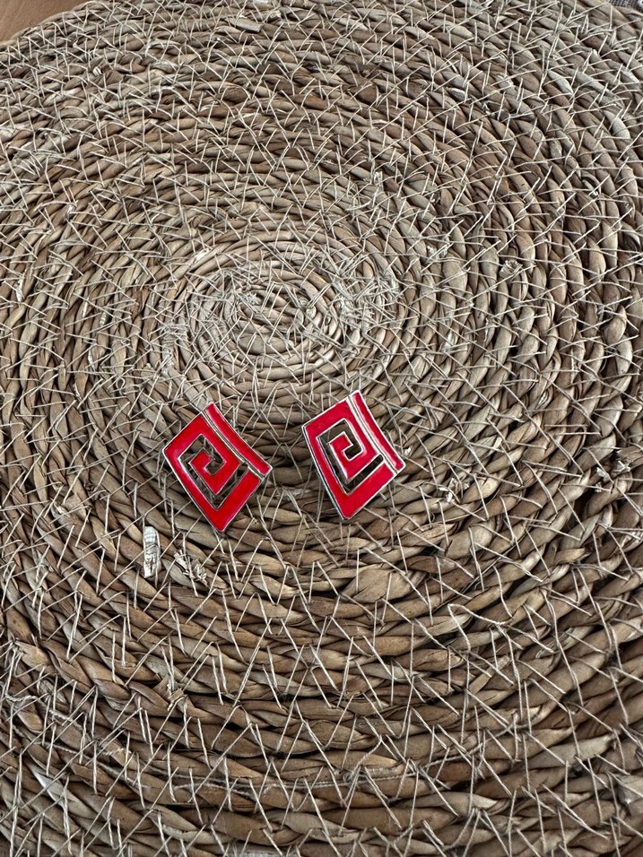 Kırmızı etnik desenli, zincir detaylı kısa uzunlukta bohem tarzda küpe.