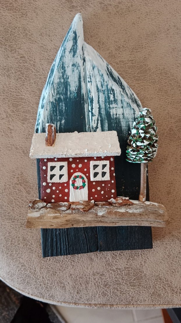 Koyu renkli yelken şeklinde arka plan üzerine yerleştirilmiş, beyaz karlı çatılı kırmızı küçük bir ev ve yeşil çam ağacı içeren dekoratif ahşap süs.