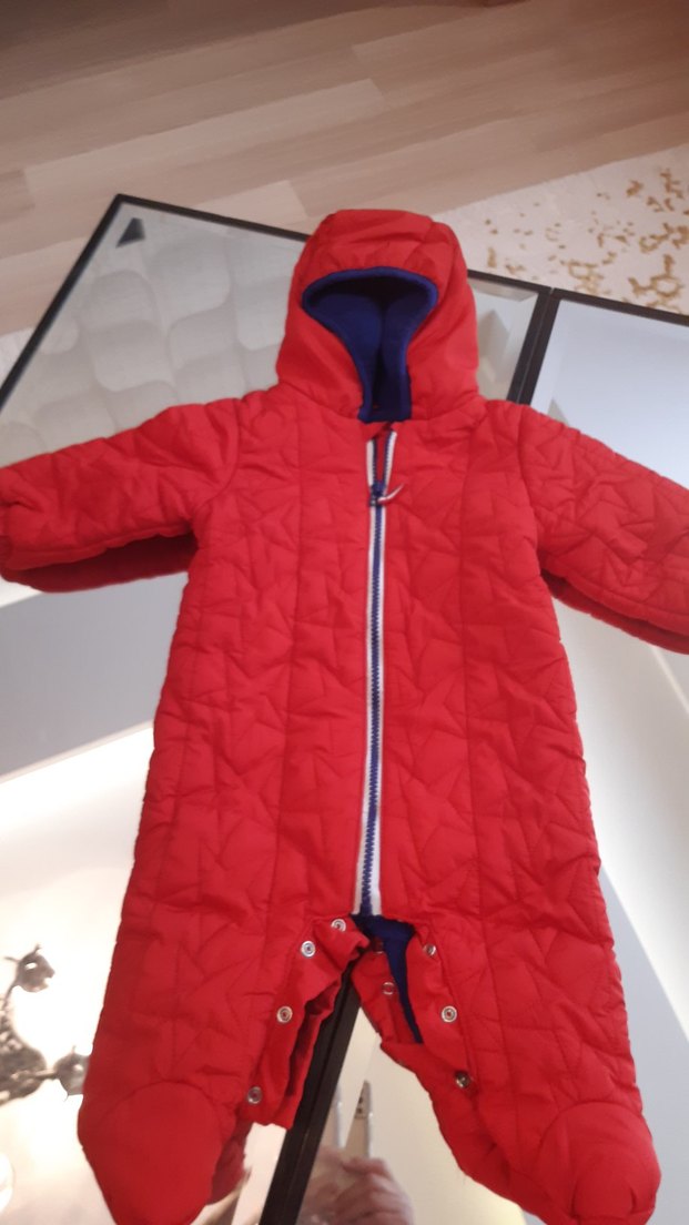 Renkli kırmızı bebek kar tulumu, fermuarlı ön kısmı ve yumuşak, sıcak kumaşıyla dikkat çeker. Kapüşonlu ve sade desendedir. ❄️