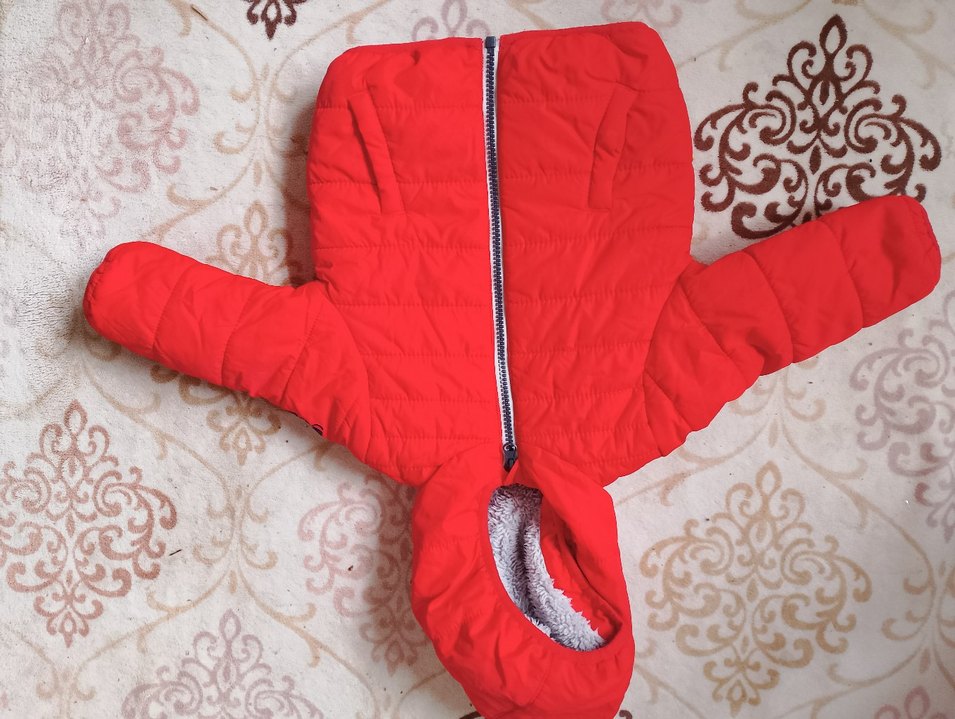 Kırmızı renkli, fermuarlı ve yumuşak, sıcak kumaştan yapılmış bebek tulumu. Kapüşonlu ve sade tasarımlıdır. ❄️