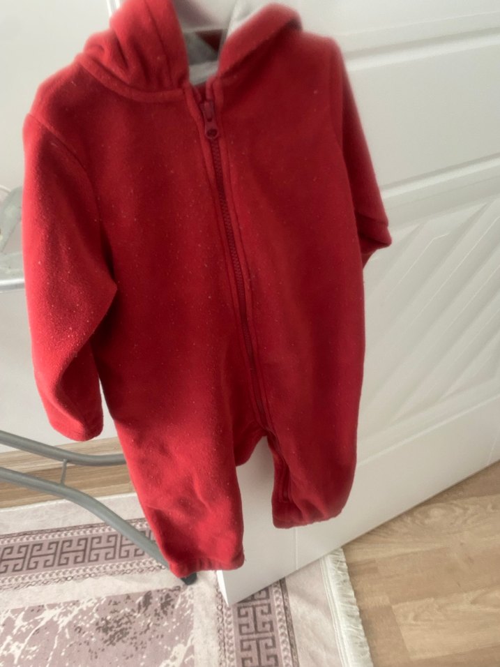 Kırmızı renkli, fermuarlı ve kapüşonlu bebek tulumu. Yumuşak ve sıcak kumaştan üretilmiştir, desensiz sade tasarıma sahiptir. Polar şapka sı penye tavşan kulaklı