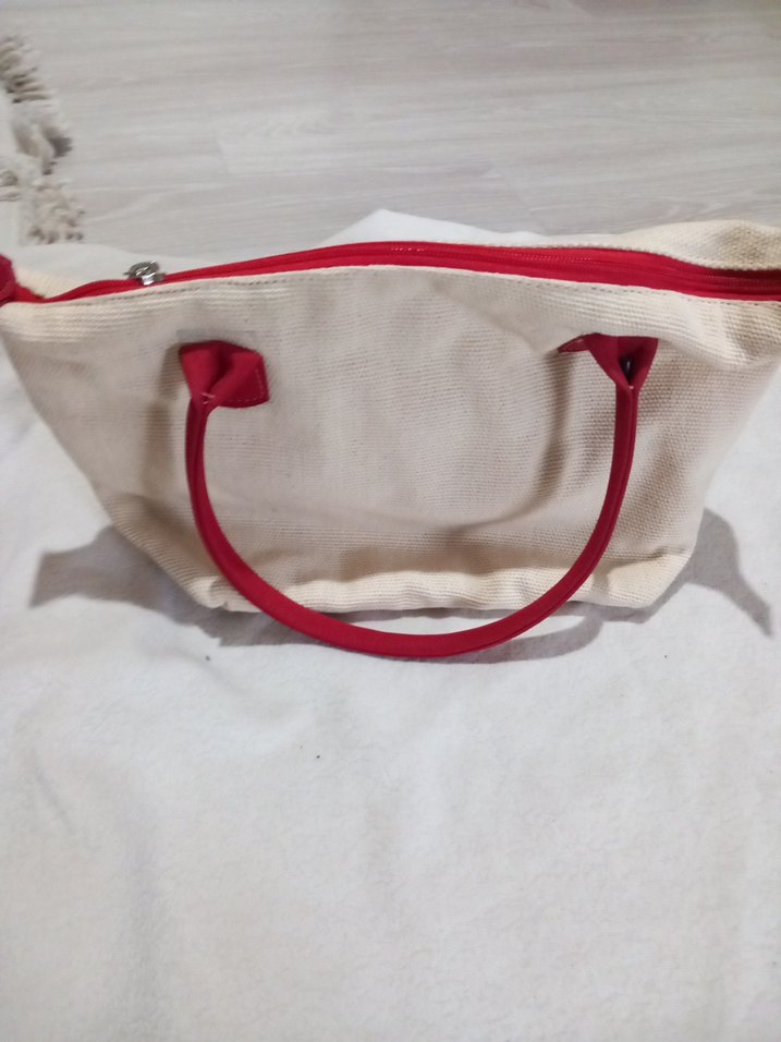 Kırmızı fermuarlı ve saplı, sentetik kumaştan yapılmış beyaz kadın çantası. Minimalist ve bohem tarzda, günlük kullanım için uygundur.