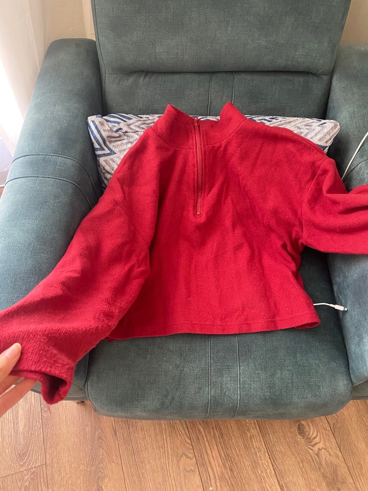 Trendyoldan almıştım, çok severek giydim, Kırmızı renkli, uzun kollu, fermuarlı boğazlı sweatshirt. hafif tüylendi o yüzden uygun fiyat