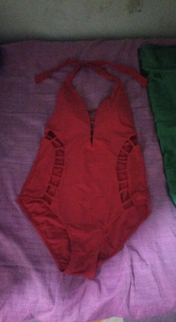 Askılı, koyu kırmızı renkte, bohem stilinde, midi boy kadın mayo. Plajda rahat ve şık kullanım sağlar. 1 kere kullanıldı