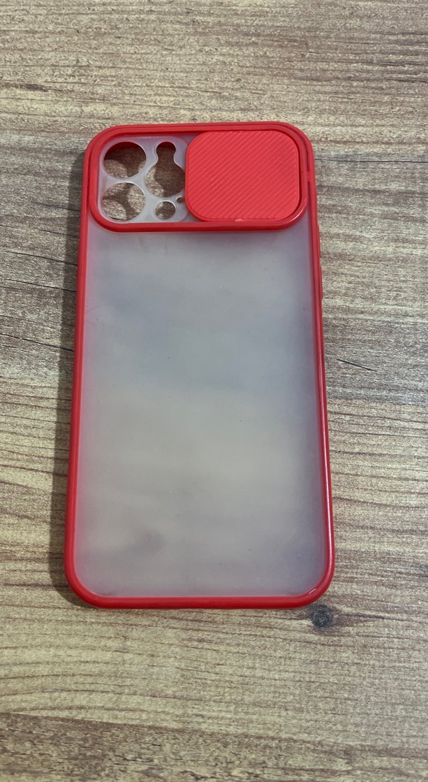 Bohem tarzda, kırmızı çerçeveli ve kamera için fermuarlı kaydırıcıya sahip, gri yarı saydam arka yüzlü telefon kılıfı.
