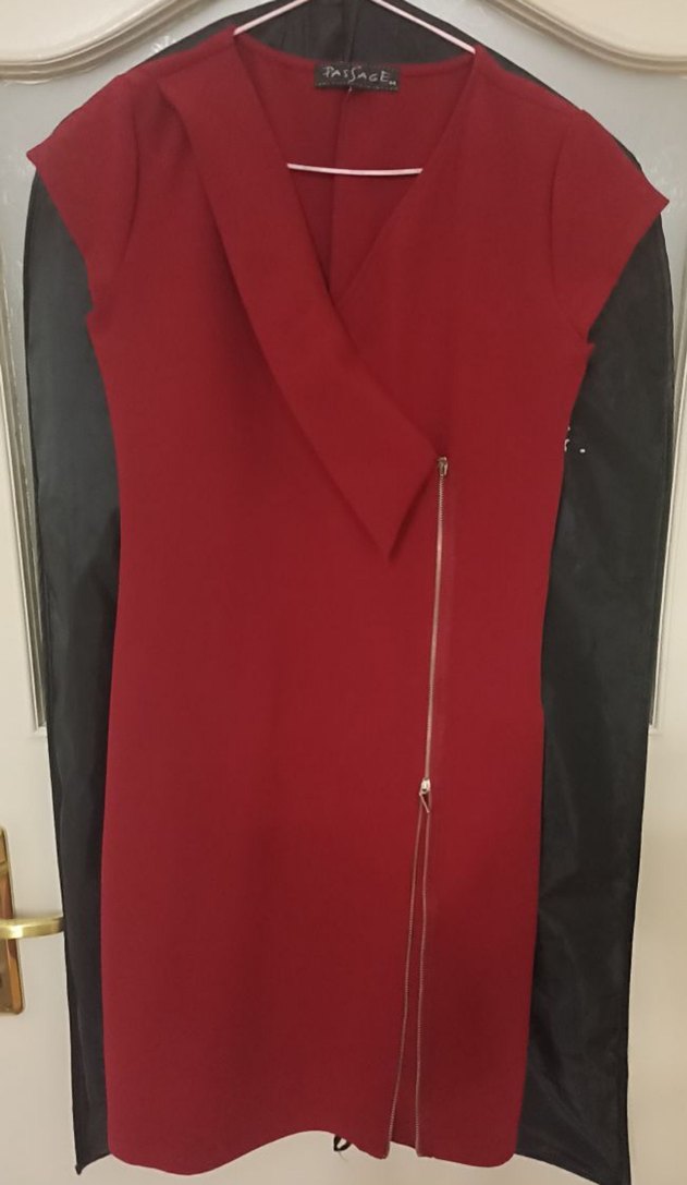 Koyu kırmızı ceket elbise, yakasında kesik detay ve asimetrik fermuar bulunur. Modern ofis stiline ve şık davetlere uygun. 38 Bedene küçültme işlemi yapılmıştır. Midi boy diz altı.