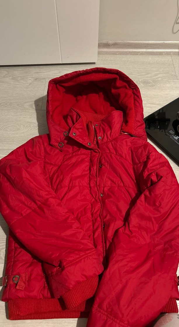 Parlak kırmızı, fermuarlı ve yüksek yakalı çocuk kışlık mont. Yumuşak ve sıcak kumaştan, normal boyda ve uzun kollu, dış mekan kullanımı için uygun.