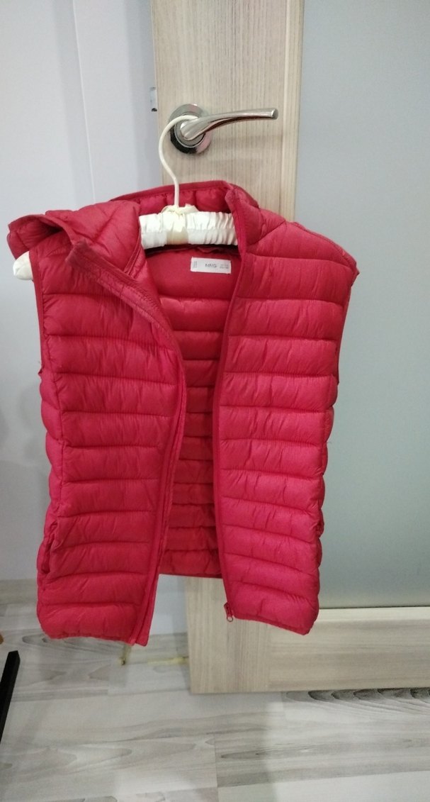 Fermuarlı, yakalı ve kolsuz kırmızı şişme yelek. Sentetik kumaştan, rahat ve şık sokak tarzı için uygun.