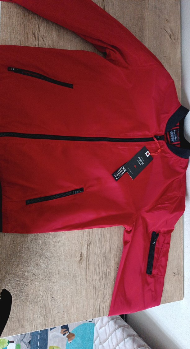 Parlak kırmızı sentetik kumaştan, fermuarlı cepleri ve kesik yakası olan erkek ceket. Normal kesim, uzun kollu, sokak giyimi ve athleisure tarzına uygun.