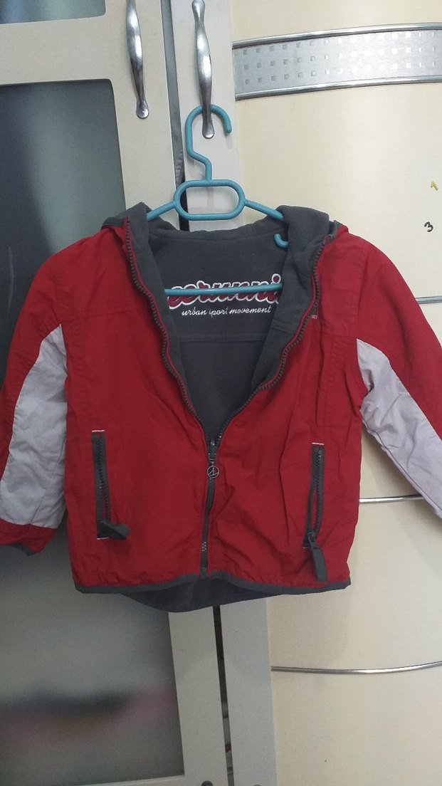 Fermuarlı, kırmızı ve gri renkli, ince kesim erkek çocuk ceketi. Yumuşak ve sıcak tutan polar kumaştan, yuvarlak yaka ve sokak tarzı için uygundur.