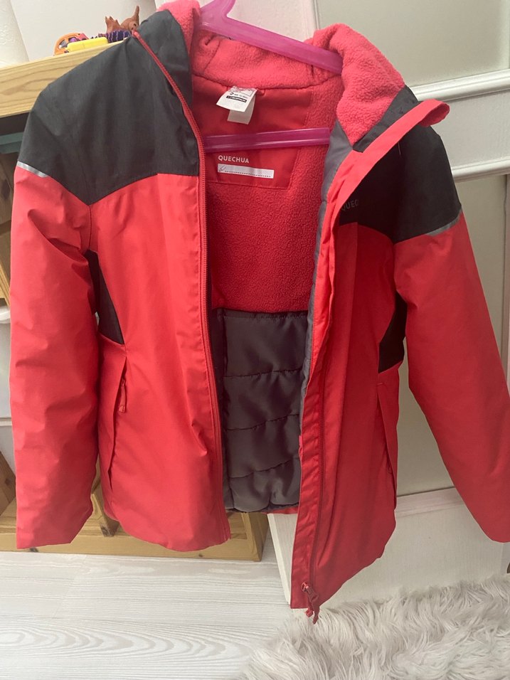 Fermuarlı, kesimli ve yumuşak sıcak kumaştan yapılmış kırmızı siyah renkli erkek çocuk kabanı. Sokak stili için uygun, desensiz model.
