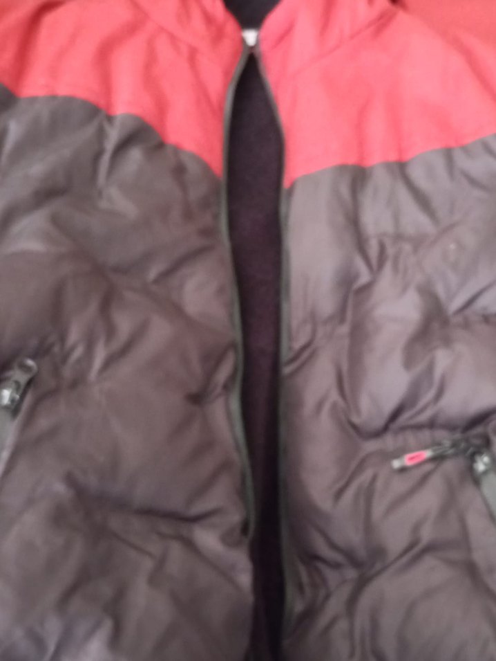 Kırmızı tonlarında, fermuarlı ve , yumuşak ve sıcak kumaştan yapılmış, normal uzunlukta erkek çocuk kış ceketi. Notch yaka detayına sahiptir.