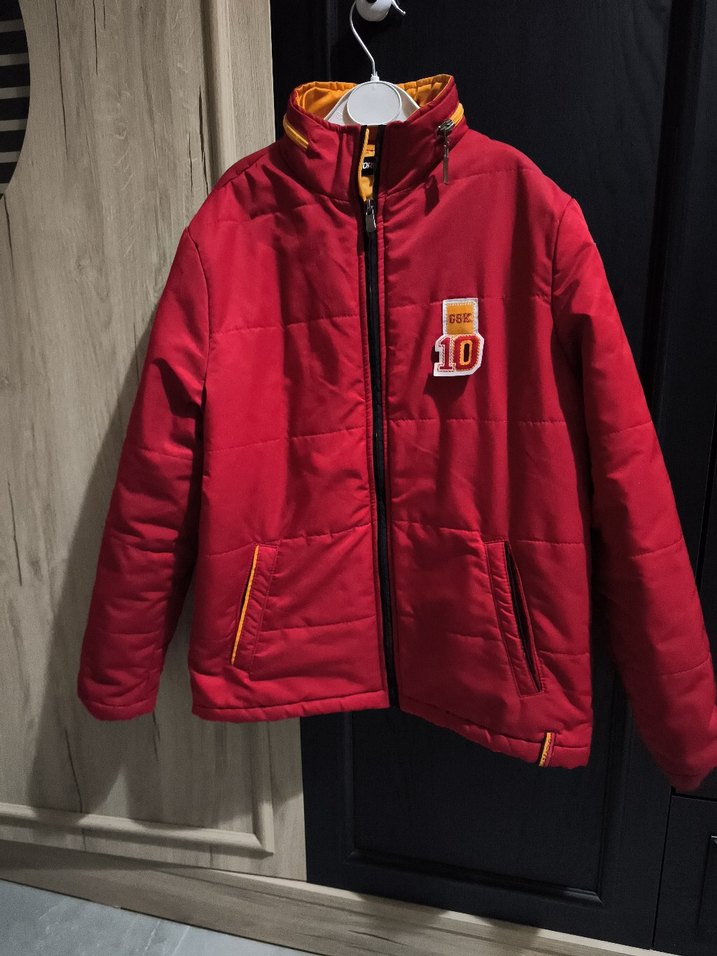 Fermuarlı cepleri ve kesik yakası olan kırmızı, renkli baskılı, içi yumuşak ve sıcak kumaşlı erkek çocuk montu. 10 numara işareti mevcut.