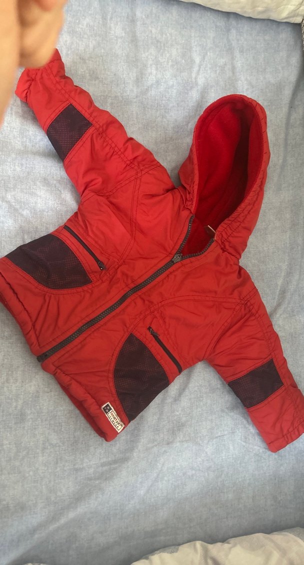 Kırmızı, fermuarlı ve kapüşonlu erkek çocuk montu, koyu renk detaylar ve kesilmiş yaka stili ile. Yumuşak ve sıcak kumaştan üretilmiştir.