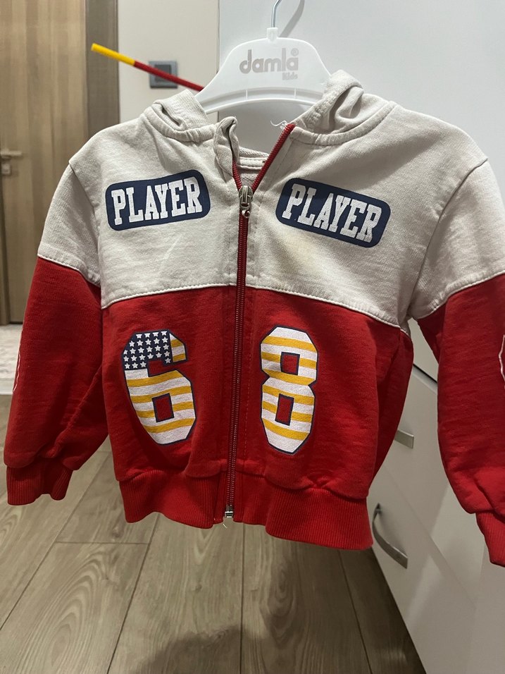 Kırmızı ve gri renklerde, uzun kollu, fermuarlı ve baskılı erkek çocuk sweatshirtü. Yumuşak ve sıcak kumaştan, bisiklet yaka ve dar kesimlidir.