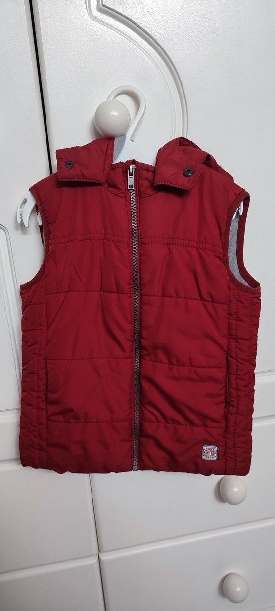 Fermuarlı, bordo renk yüksek yakalı, kolsuz erkek çocuk yeleği. Yumuşak ve sıcak kumaştan, dar kesim, günlük rahat stil için uygun.