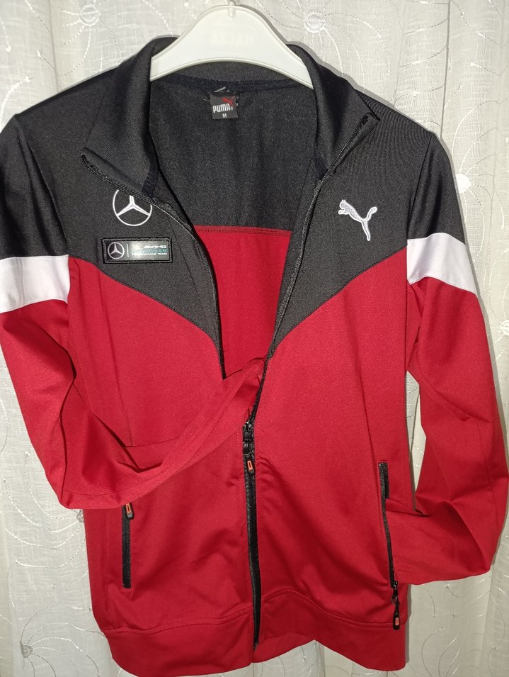 Koyu kırmızı ve siyah renklerde, fermuarlı cepleri olan, yumuşak ve sıcak dokulu erkek Notched lapel yakalı, baskılı logolu normal kesim eşortman takımı üst uzunluk 71 iki kol arası 55 kol, 66 alt için uzunluk 98 basen 53