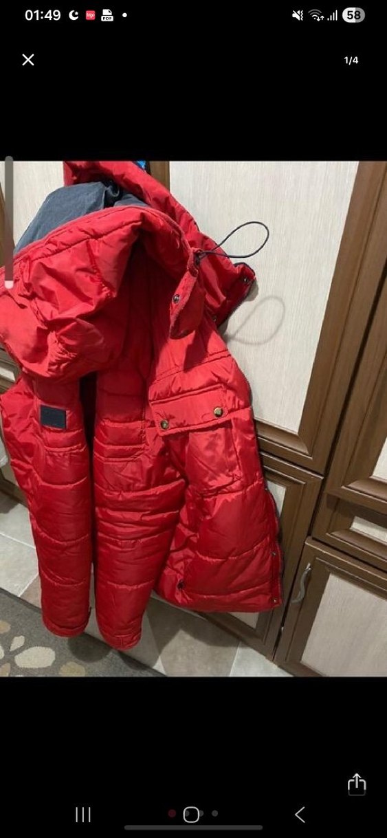 Fermuarlı, yakalı ve normal uzunlukta kırmızı erkek mont. Yumuşak ve sıcak kumaştan, günlük rahat sokak stili için uygundur.