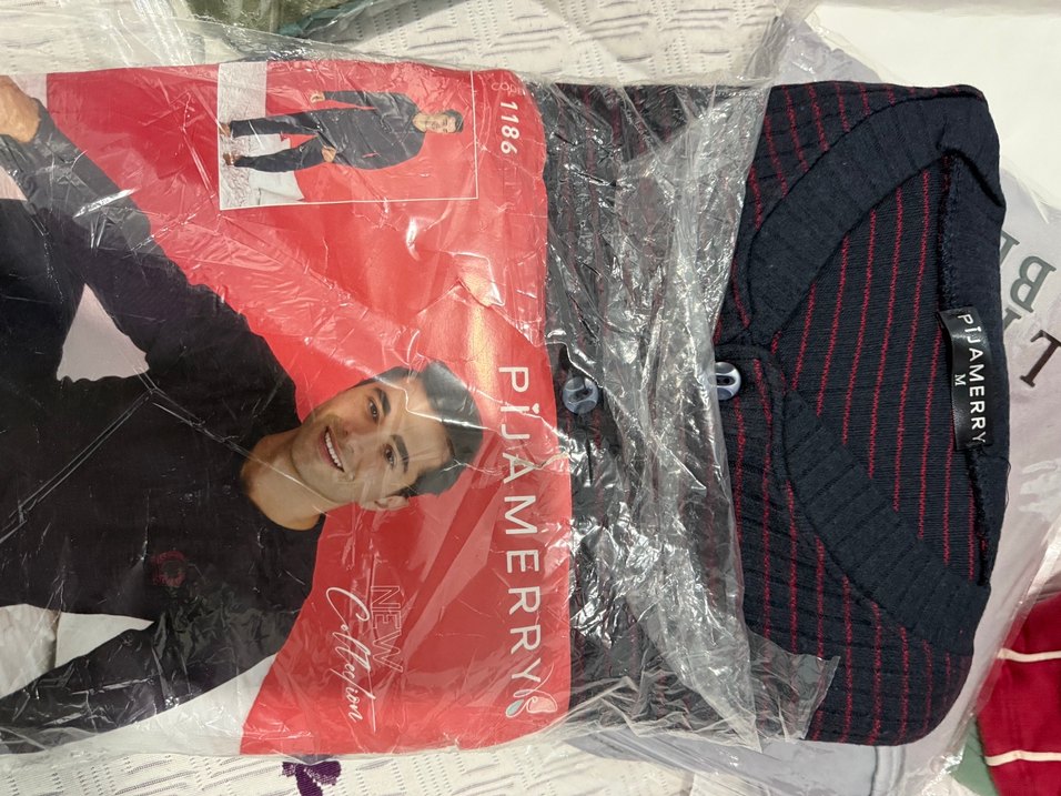 Fermuarlı, kırmızı baskılı erkek pijama takımı. Notlu yaka ve uzun kollu, midi boyda, sokak stili ve athleisure esintili.