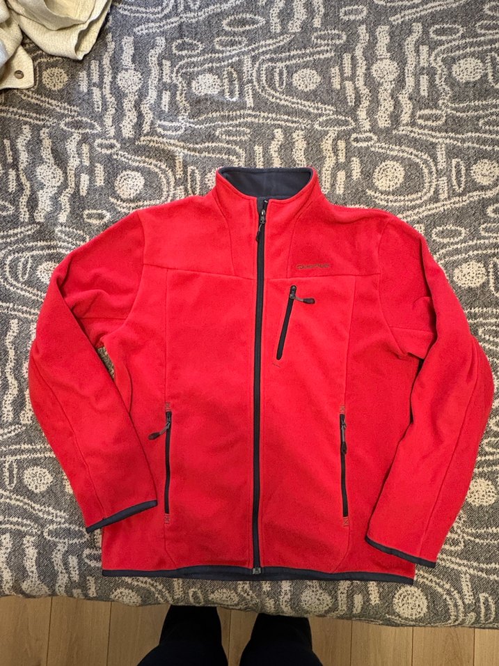 Kırmızı renkli, fermuarlı ve cep fermuarları bulunan erkek polar sweatshirt. Uzun kollu ve standart kesim, günlük ve açık hava kullanımı için uygundur.