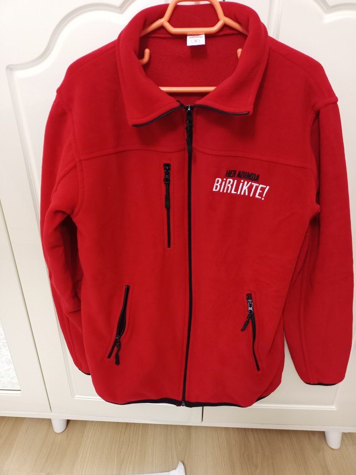 Kırmızı erkek polar sweatshirt, tam fermuarlı, uzun kollu ve yuvarlak yakalıdır. Göğüste "BiRLiKTE!" baskısı ve fermuarlı cepleri vardır. Sokak stili, dış mekan için uygundur.