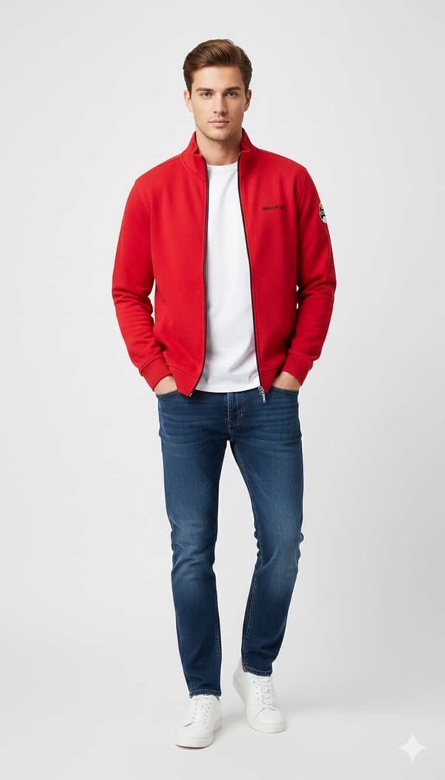 Kırmızı renkli, fermuarlı ve uzun kollu erkek sweatshirtü, regular fit ve crew neck kesimlidir. Yumuşak fleece kumaştan üretilmiştir, günlük kullanıma uygundur.