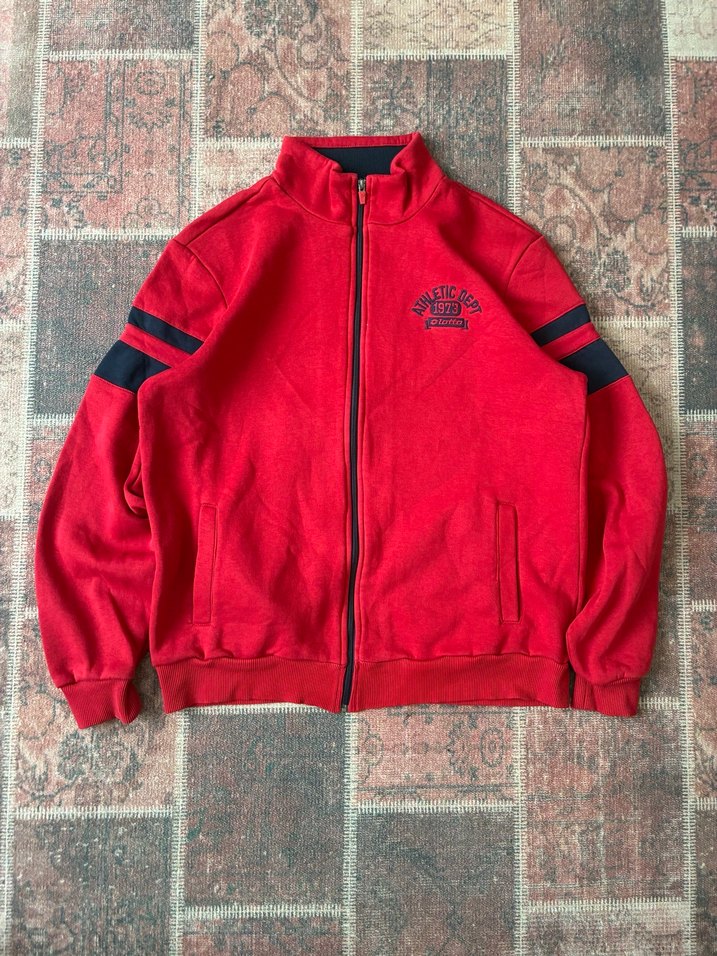 Kırmızı renkte, yüksek yakalı ve uzun kollu erkek sweatshirtü. Kollarında siyah şerit detayları ve fermuarlı ön kısmı bulunur. Yumuşak kumaştan, sportif sokak stili için uygun.