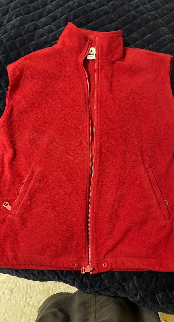 Kırmızı fermuarlı, yüksek yakalı, kolsuz erkek polar yelek. Fermuarlı cepleri ve normal uzunluğu ile günlük kullanım için uygundur. Biraz tüylenme var 5 beden yazıyor